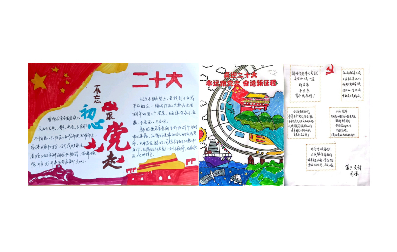 在支部全体党员认真收看二十大盛况后,支部首先开展了“我学二十大手抄报线上展示分享”主题党日活动,以图文并茂的形式,熟悉原文、把握重点、加深理解。部分党员与身边孩子一起共同完成了学习二十大手抄报,在精心设计制作过程中,以浅显易懂的语言向孩子们分享学习心得体会,使报告金句跃然纸上。